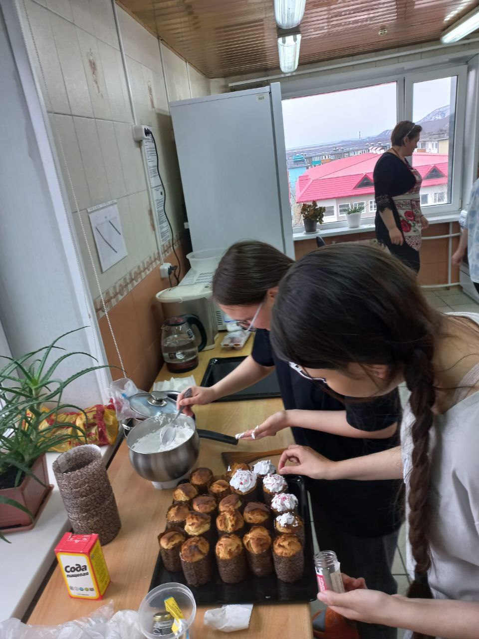 Ребята вместе с воспитателями и преподавателями испекли пасхальные куличи и отправили их в качестве подарков больным, которые находятся на лечении в стационарном отделении Камчатской краевой больницы.